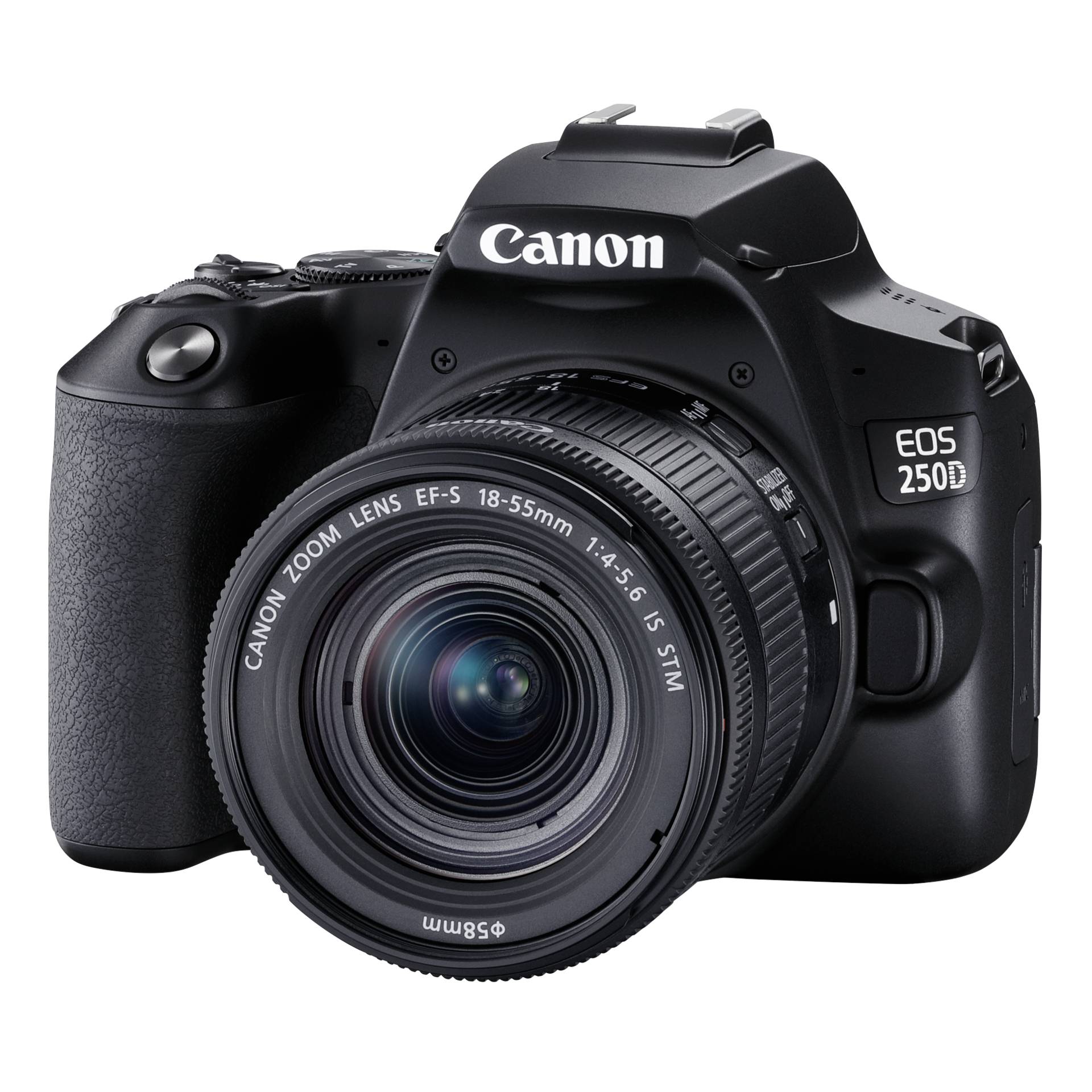 Descubre la Canon EOS 250D, la DSLR más ligera con pantalla orientable, ideal para los entusiastas de la fotografía y el video. Con su sensor APS-C de 24,1 MP y su procesador DIGIC 8, captura imágenes nítidas y coloridas incluso con poca luz. Su visor óptico y el autoenfoque Dual Pixel CMOS AF garantizan fotos precisas y rápidas, mientras que la pantalla táctil orientable facilita los selfies y los ángulos creativos.Puntos fuertesFotos de alta resolución de 24,1 MP y videos 4K UHDPantalla LCD táctil orientable de 3,0″ para mayor flexibilidadDual Pixel CMOS AF con reconocimiento de ojosConexión Wi-Fi y Bluetooth para un intercambio instantáneoModos automáticos y guía creativa para principiantes y expertosObjetivo EF-S 18-55 IS STM incluidoRango focal de 18-55 mm (equivalente a 29-88 mm) versátil para retratos y paisajesEstabilización óptica de 4 pasos para imágenes nítidasMotor STM para un enfoque silencioso en videoDistancia mínima de enfoque: 0,25 mCompacto y ligero para fotografía y video en movimientoEspecificaciones técnicas claveSensor APS-C CMOS de 24,1 MPVisor óptico de pentaprismaResolución de video: 4K 25fps, Full HD 50fpsPantalla LCD de 3,0″ táctil orientableISO: 100-25600, ampliable a 51200Tarjetas de memoria: SD / SDHC / SDXCPeso: 451 g (cuerpo) / 205 g (objetivo)Contenido del kitCanon EOS 250D cuerpo negroObjetivo EF-S 18-55 IS STMBatería LP-E17 y cargador LC-E17EOcular EF, tapa del cuerpo, correa de transporteManual de usuario y cable de alimentación
